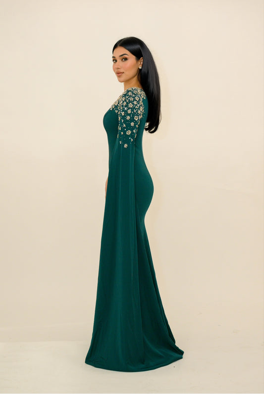 Asman Embellished Dramatic Cape Long Sleeve Modest Evening Dress