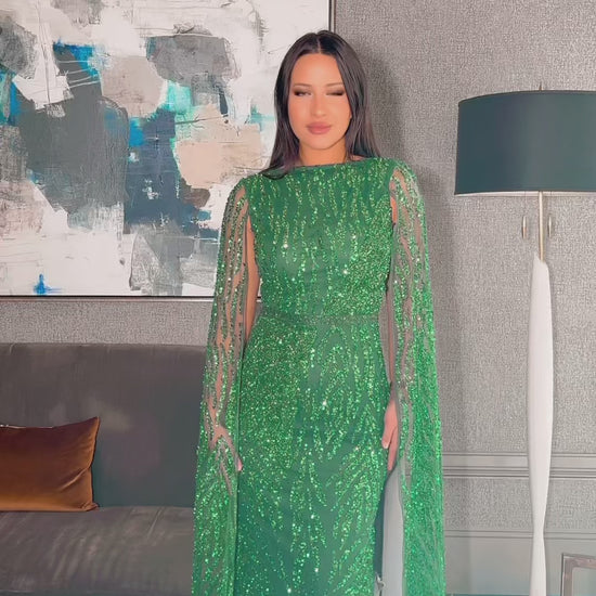 The Nabilah Embellished Cape Sleeve Dress is the modest dress of your dreams! This dress is fully lined except sleeves. This drape sleeve evening gown made of thousands of hand sewn sequins and embellished sash leaf accents. The uniqueness of this gown is exuded with the leafy sash -- giving it a dramatic flare. The dress has a little train, and is floor length. You'll look and feel beautiful in this sophisticated, yet modest style. Enjoy the elegance of the flowing train as you make your statement with confidence and grace.