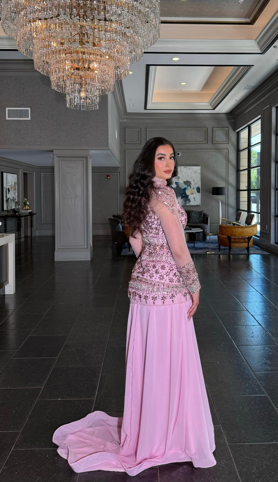The glamorous floor-length gown in a soft pastel pink shade with exquisite embellishments.
